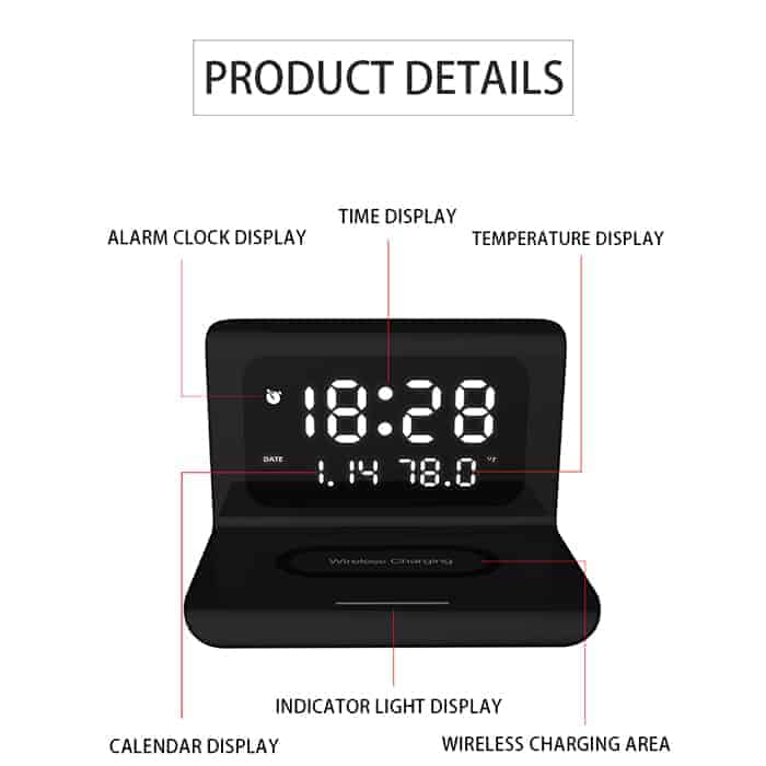 óra vagy ébresztőóra (12/24 időrendszer), naptár, hőmérő (Celsius / Farenheit), vezeték nélküli töltő