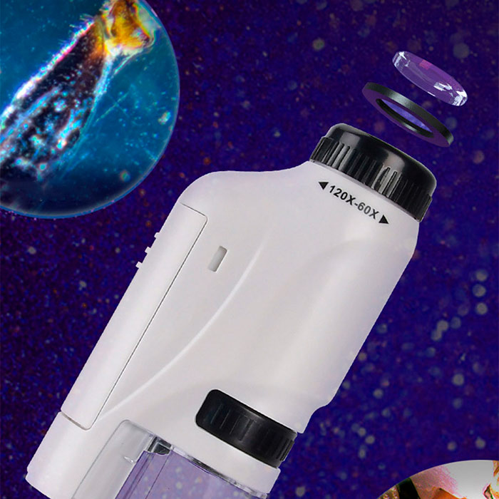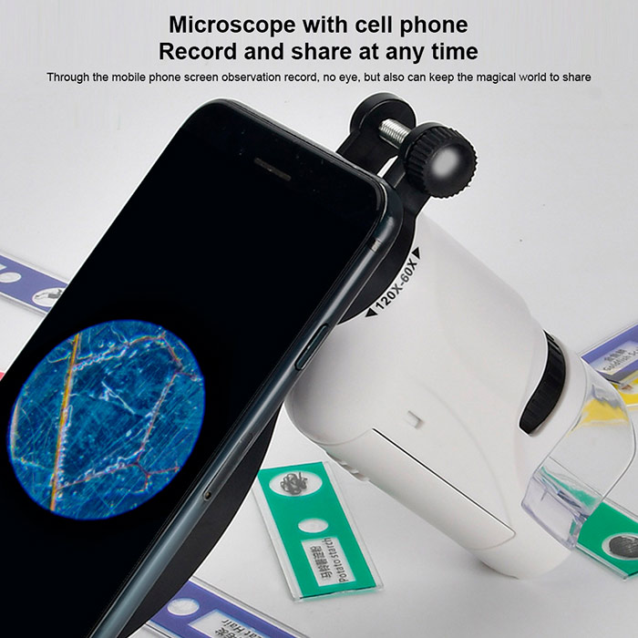 Helyezz be 2 AAA elemet (nem tartozék) a mikroszkópba. Forgatd a lencse gyűrűjét, hogy 60x-től 120x-ig nagyítsd az objektumokat. Használd az okostelefonoddal. Amikor a lencse közel kerül az objektumhoz, kapcsold be a LED-et. Válaszd ki a megfelelő nagyítási faktort a nagyítási keréken. Állítsd be a nagyítási keréket, hogy az kép éles legyen. Ezután készíts fényképeket a nagyított objektumokról. |